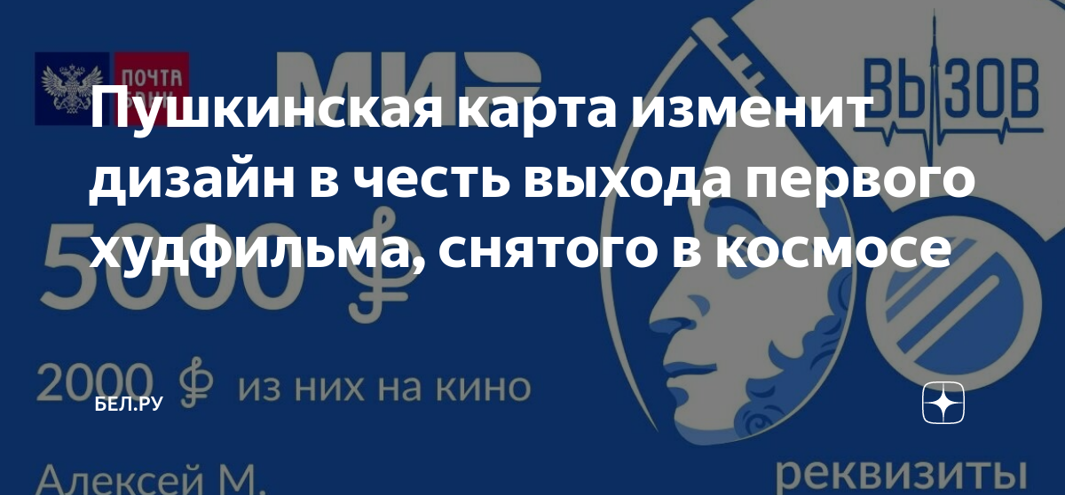 17.04.2023Пушкинская карта изменит дизайн по случаю выхода первого художественного фильма, снятого в космосе