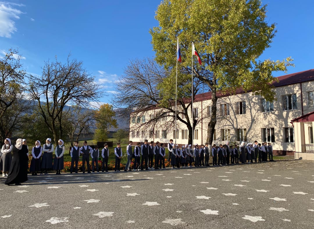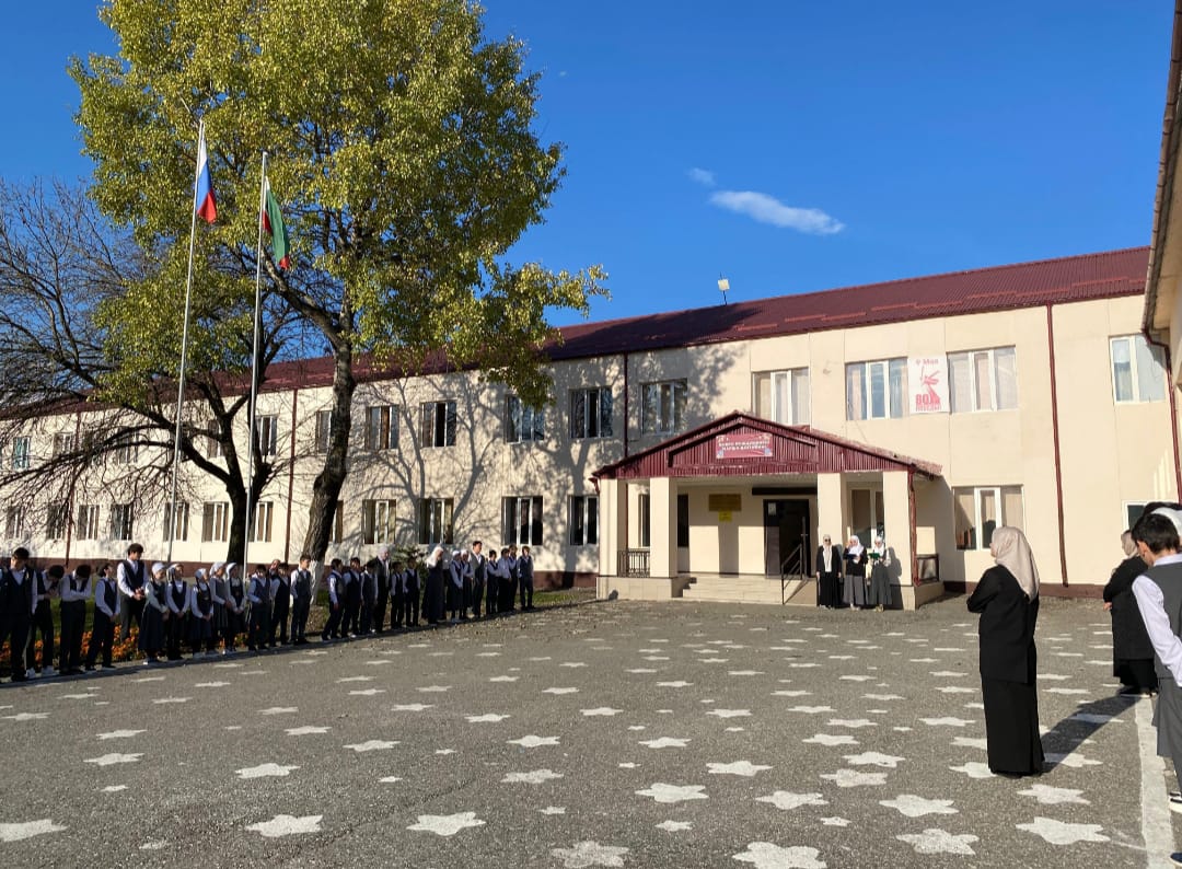 Мы начинаем нашу учебную неделю с традиционной церемонии поднятия флагов Российской Федерации и Чеченской Республики.
