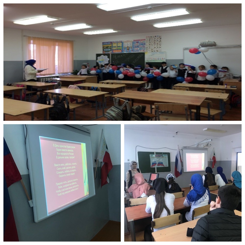 Классными руководителями 1-2 классов был проведен конкурс рисунков «Единый народ», а также для учеников 5-11 классов были проведены классные часы на тему «В единении - сила!» Целью данных классных часов являлось: